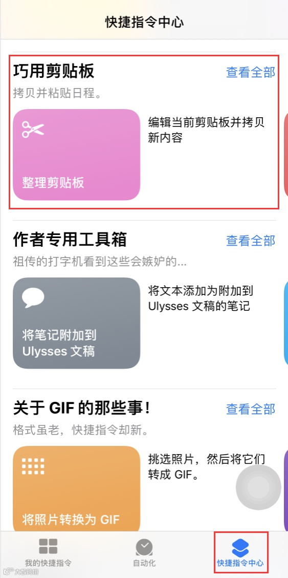 1.打开“快捷指令”应用,前往“快捷指令中心”,下拉找到“巧用剪贴板”并点击“查看全部”。