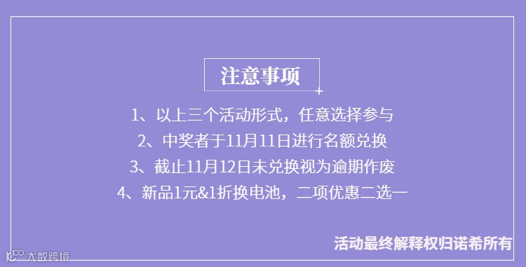 转发双十一微博话题#诺希双11硬核1元秒新品,全民1折换电池#并关注诺希微博,数量有限,先转先得。