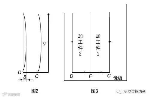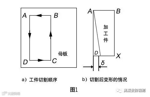 当完成AD段的切割,加工DC段时,由于CD段余料窄,切割时高温使DC段余料产生线性伸长,CB段向外偏转,切割后使DC段尺寸缩小(图1b所示)。8的大小与DC段的尺寸成正比,如果选择A-B-C-D-A的七个顺序,工件最后经DA与母版分离,可有效较小切割变形。