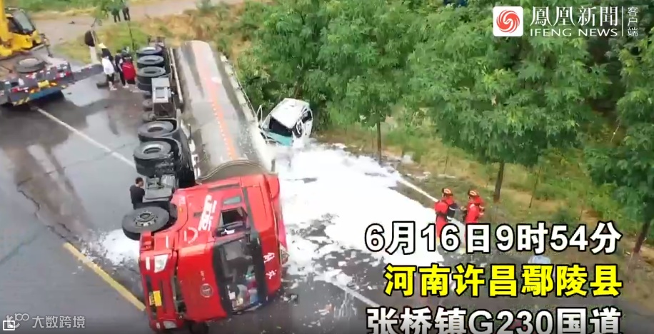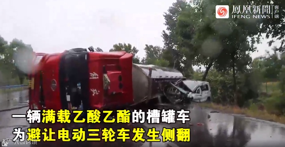 事件:6月16日9时54分,河南省许昌市鄢陵县张桥镇G230国道一辆满载乙酸乙酯的槽罐车为避让电动三轮车发生侧翻。
