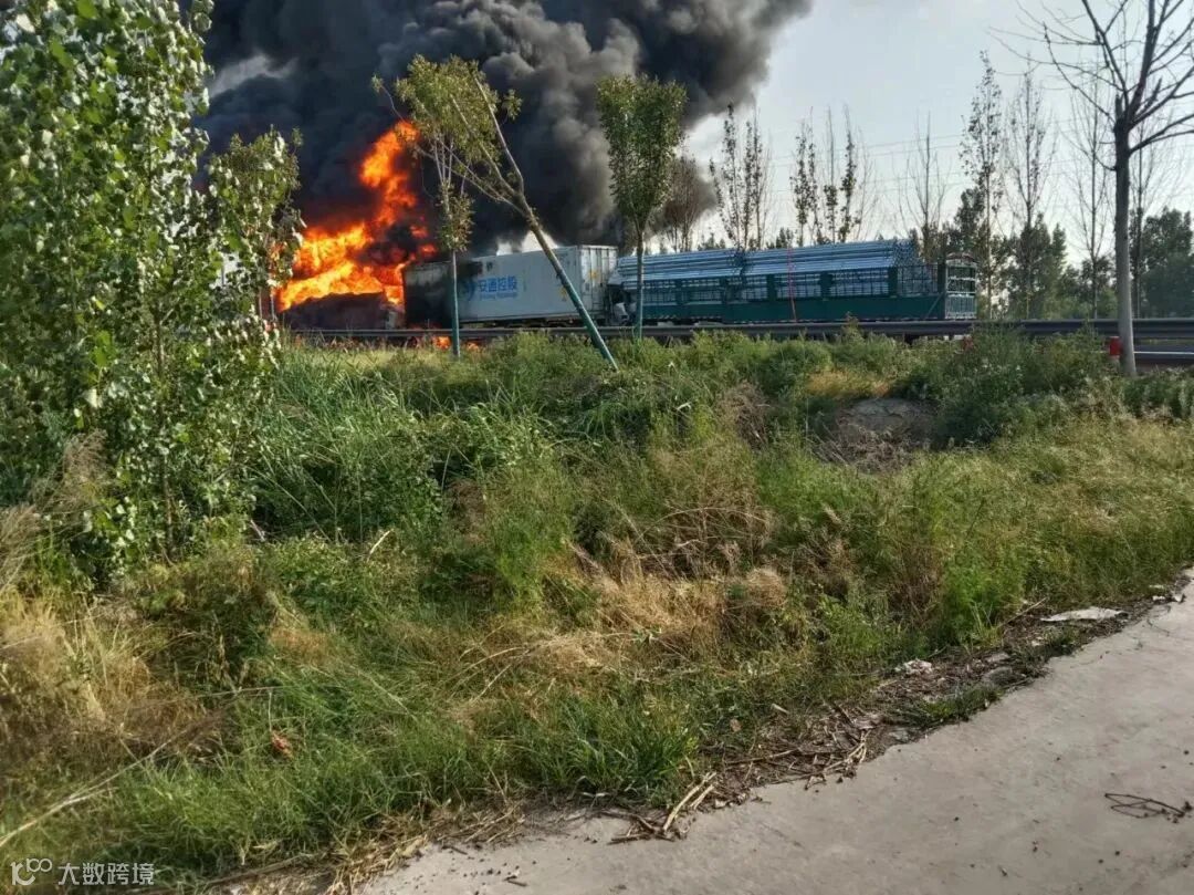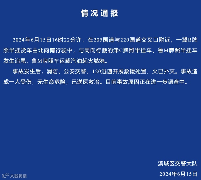 事件:6月15日16时22分许,在205国道与220国道交叉口附近,一冀B牌照半挂货车由北向南行驶中,与同向行驶的津C牌照半挂车、鲁M牌照半挂车发生追尾,鲁M牌照车运载汽油起火燃烧。