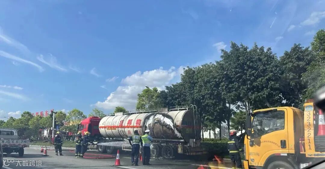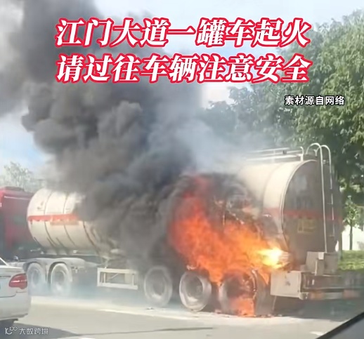 事件:6月20日下午,广东江门大道迎宾车城往鹤山方向一槽罐车突发起火。