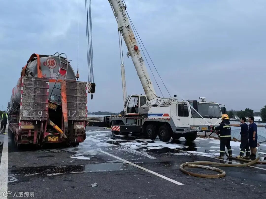 河南一三十三吨危化品槽罐车侧翻泄漏