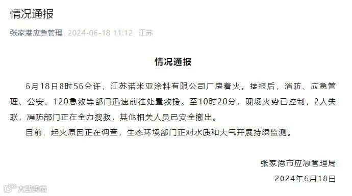 事件:6月18日上午,据张家港市应急管理局通报,当日8时56分许,江苏诺米亚涂料有限公司厂房着火。
