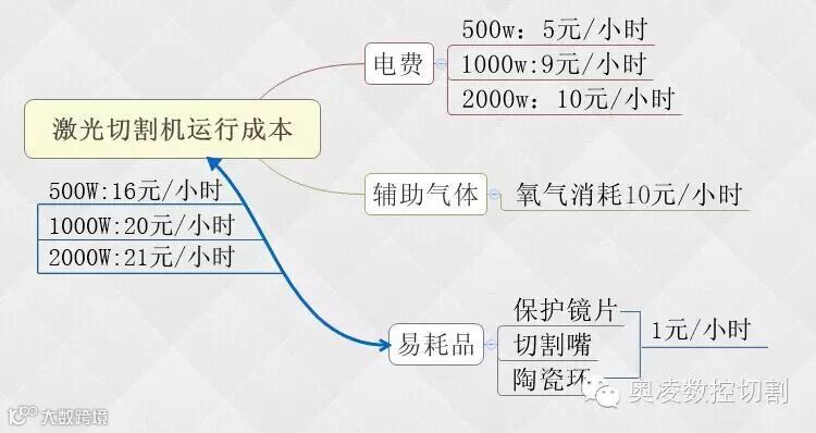 我们分别以500W、1000W、2000W光纤激光切割机为例,使用氧气气体,每小时的运行成本为: