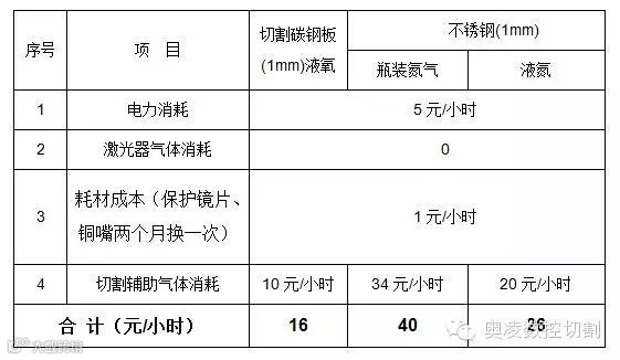 切割1mm不锈钢/碳钢板,切割速度为18米/分钟,消耗的电费为5元/小时,液氧气体费用10元/小时。加上保护镜片3个月换一片,每片100元的市价,切割嘴一个60元的市价,耗材成本(保护镜片、铜嘴两个月换一次)就是1元/小时,总成本:16元。