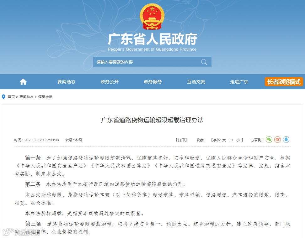 《广东省道路货物运输超限超载治理办法》(以下简称《办法》)将于2024年1月1日起施行。
