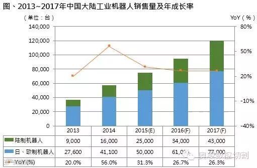 据悉,近年中国大陆积极主导经济发展转型,再加上人口红利流失,境内劳力密集的低端制造业正逐渐转型为技术密集的高端制造业,因此高度自动化的需求水涨船高,带动工业机器人在中国大陆地区的销售量快速成长。