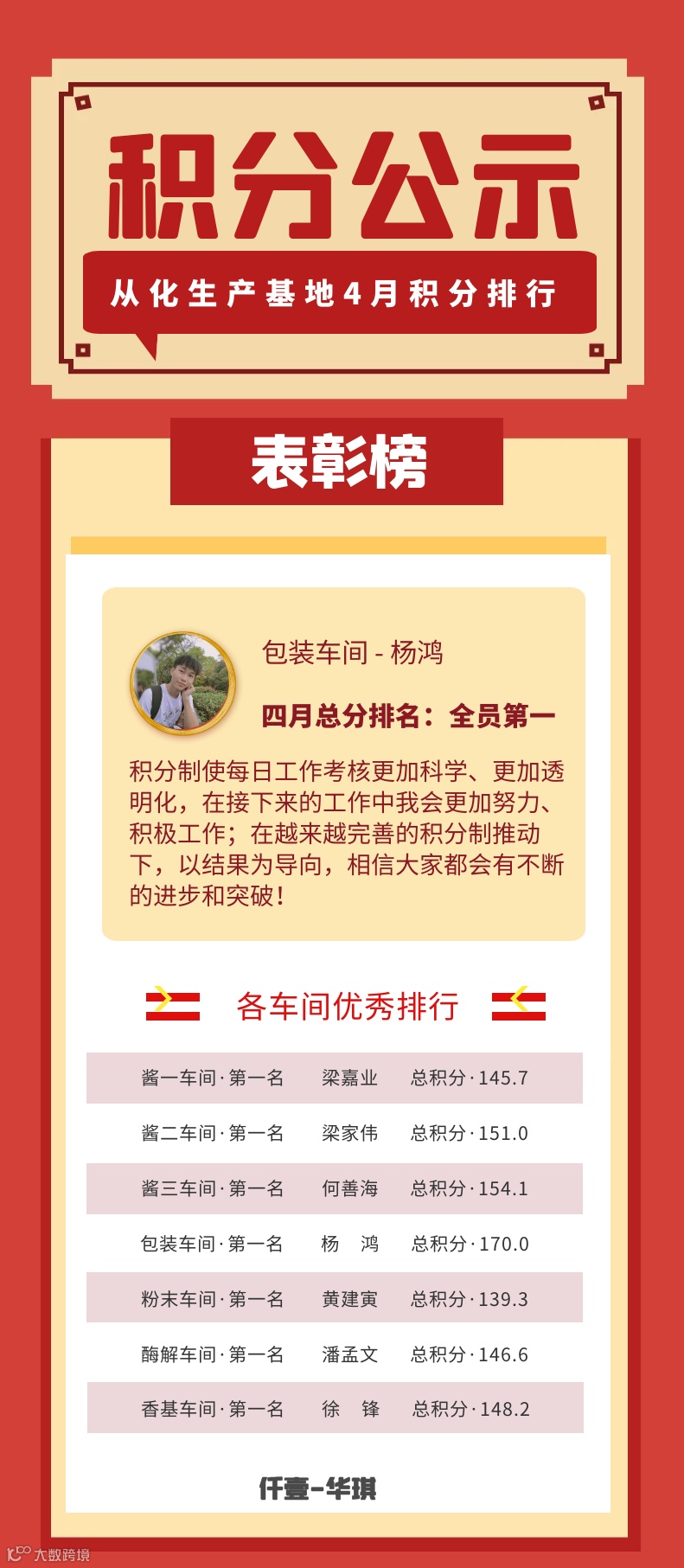 自四月以来,积分制管理在从化生产基地正式导入实施后,不仅调动了员工的积极性与主动性,而且在厂区里形成了人人比积分,人人争第一的积极向上氛围!