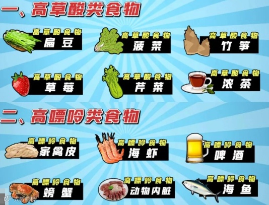 尿酸结石是由于体内尿酸过高形成的。要避免高嘌呤食物,如动物内脏、海鲜(特别是沙丁鱼、虾、蟹等)、肉汤、啤酒等。适合的食疗食物有: