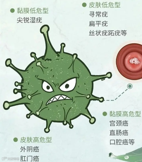 HPV 有多种亚型,分为高危型和低危型。低危型 HPV 感染则可能引起生殖器疣等病变。高危型 HPV 持续感染值得警惕,它不止会威胁宫颈,还可能会诱发其他高危害性的疾病。我们已知的高危型包含 HPV 16 / 18 / 31 / 33 / 35 / 45 / 52 / 58 等[5],持续的高危型 HPV 感染可能导致宫颈癌、肛门癌、阴道癌、外阴癌、阴茎癌、口咽癌、癌前病变等疾病。因此,对于HPV感染应给予足够的重视,及时进行监测和干预,以降低HPV感染发生的风险。