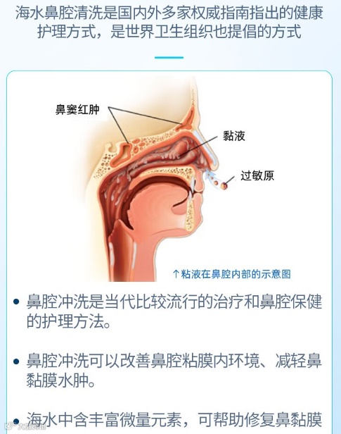 此外,鼻黏膜表面有黏液纤毛清除系统,该系统对鼻腔有较强的清洁以及保护作用,鼻腔冲洗也可以提高鼻黏膜黏液纤毛清理的效率,增强其自洁和保护作用。