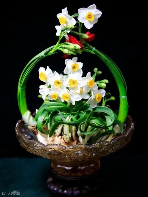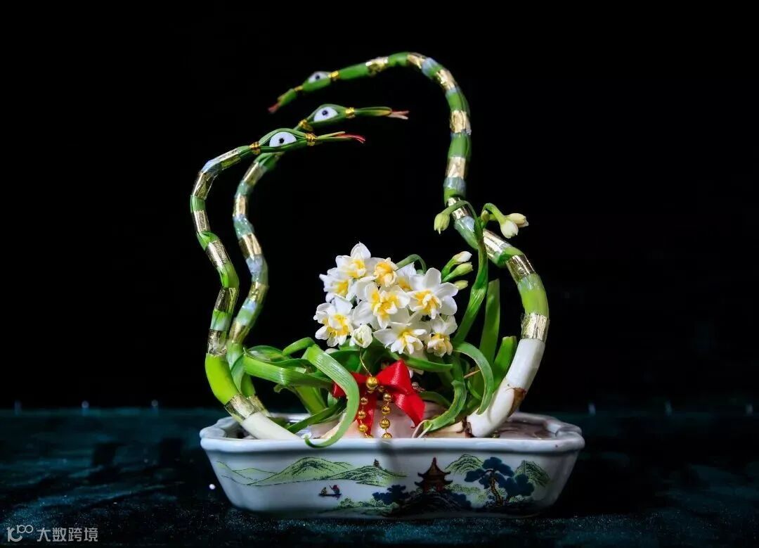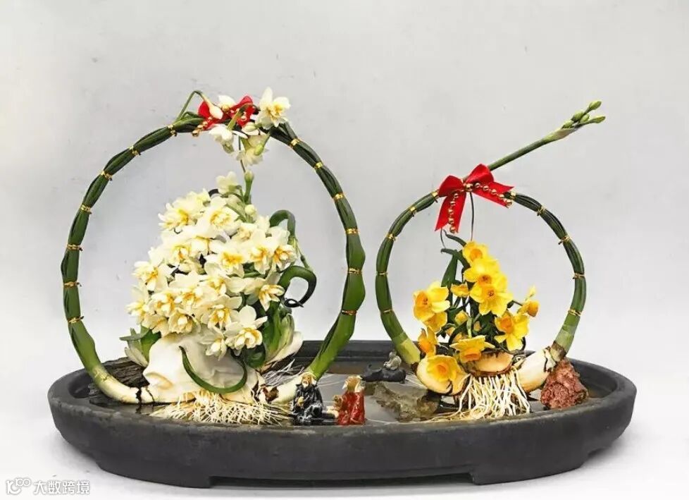 通过刀刻或其他手段使水仙的叶和花矮化、弯曲、定向、成型,根部垂直或水平生长。雕刻时,使器官的一侧或一面受损伤,这样叶片或花梗就会向受伤的一侧或一面弯曲,达到艺术造型的目的。