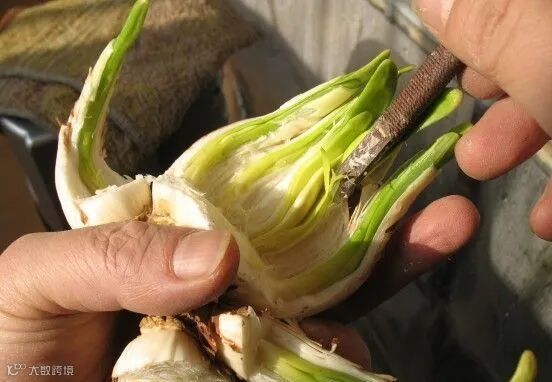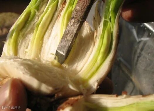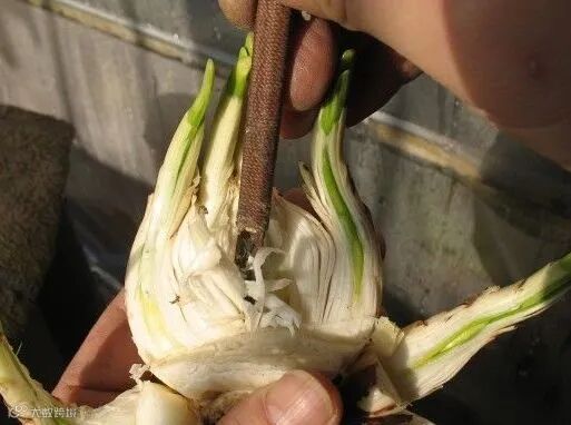 a、在根部以上1 厘米左右处横切一刀,最好不要一次切入太深,以免切断叶片和花埂,然后再纵切一刀,小心地切下鳞片,使全部芽体显露出来为止。
