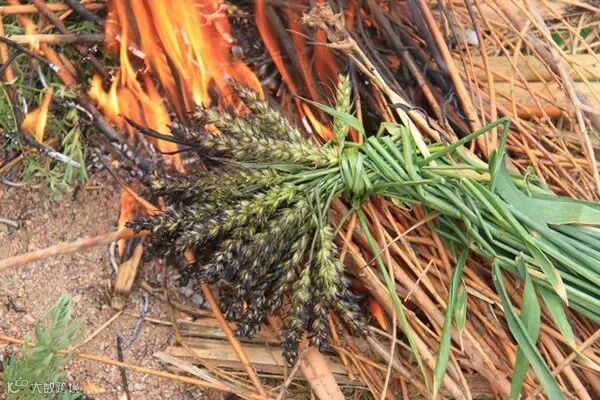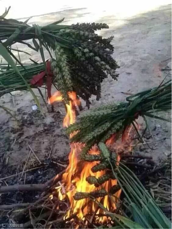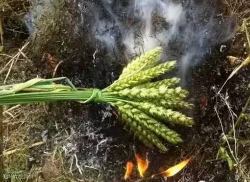 将新取得麦穗穗头对齐放至点燃的麦秆上。