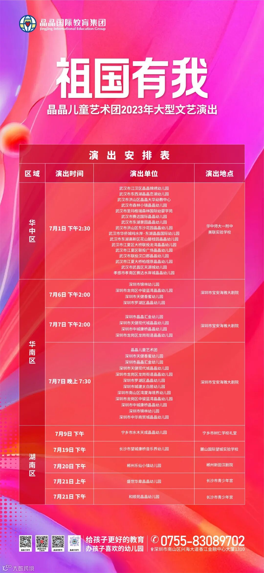 7月1日-7月21日,晶晶国际教育集团三大区将陆续在武汉、深圳、长沙等地开展9场大型文艺演出活动。近200个精彩节目,4000余名幼儿参与,多场活动还将进行线上直播。
