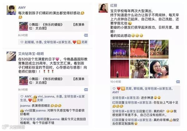 本次盛典活动在家长圈中同样引起了很大关注,他们有来自于正在就读晶晶幼儿园的孩子家长,有已经从晶晶幼儿园毕业的孩子家长,还有很多非晶晶幼儿园孩子的家长,三天时间内,他们将对本次幼儿表演的所想所感在微信朋友圈大量转发,引爆了整个朋友圈,这是社会对晶晶的又一次肯定!