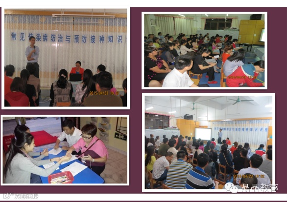 罗湖晶晶幼儿园一贯非常关注孩子的健康成长,为了让家长朋友更进一步了解3-6岁儿童常见传染病防治及预防接种,更好的做到家园共育。2015年4月23日17:00,罗湖晶晶幼儿园很荣幸邀请到深圳市罗湖区妇幼保健院儿保科周医生在百忙之中来到幼儿园为我们家长进行《幼儿园常见传染病防治及预防接种知识》的专题讲座。