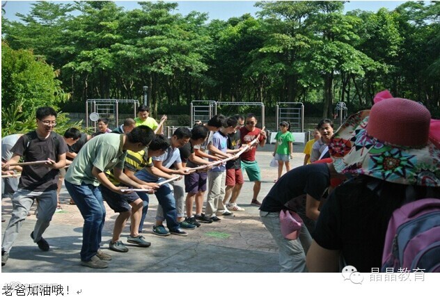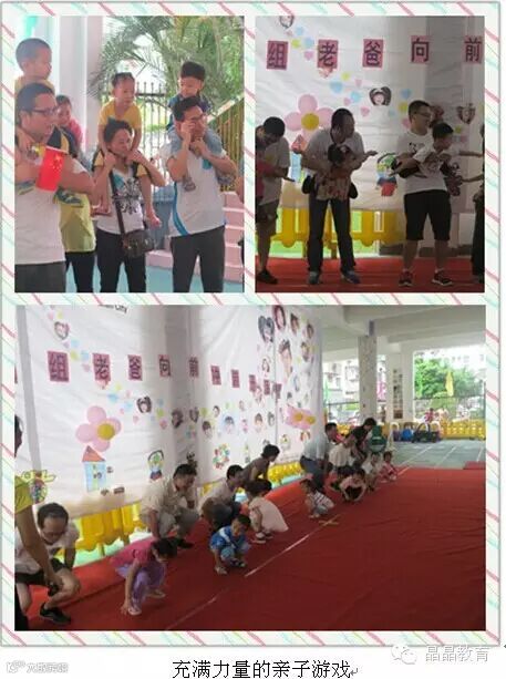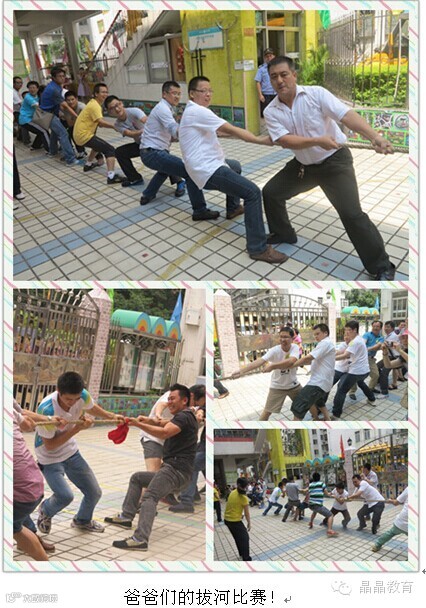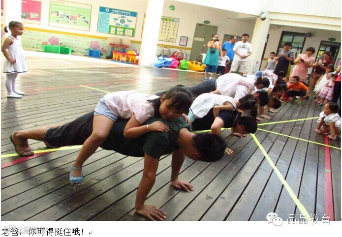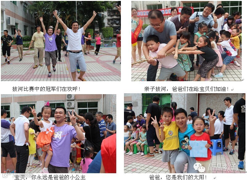 晶晶盛世华章幼儿园举办了一场以“爸爸去哪儿”为主题的专属活动。我们的爸爸不光会赚钱,还一样很细心,在玩游戏时,不顾一切的努力用自己的行动告诉孩子他们对孩子的爱,只有爸爸才会将孩子放在肩上不拘小节的扛着。拔河比赛时,有的爸爸手受伤了,但听到宝贝用力嘶喊“爸爸加油”,他不顾一切疼痛拼尽全力,给孩子们树立了很好的榜样,最后送爱心时,看到爸爸们用大手捂着那个小爱心是多么珍惜,满满的都是感动。这次活动中,游戏环节将整个活动推向高潮,每位爸爸都毫不逊色的展示自己了实力,赢得了宝贝们的阵阵掌声和欢呼声,想必这是一件最幸福的事儿!
