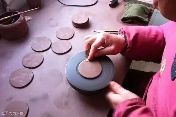 15、筒(筒盖头)。把虚盖放在盖板上,用脂泥粘住,然后用盖头篦只篦出所需要的壶盖轮廓。