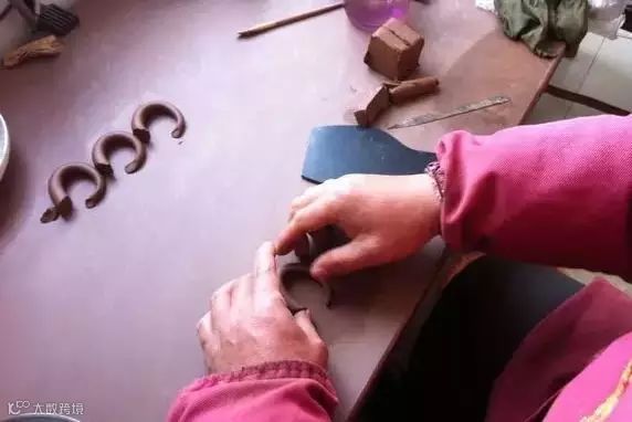 9、搓(搓嘴、把)。预先准备好的嘴把泥,用手搓出需要的嘴把初型,需用手掌的技巧来控制嘴把的粗细与大小长短。然后弯出形体,有经验的艺人,搓出的嘴把能一步到位,且与壶身连接协调和谐,并富有神韵。