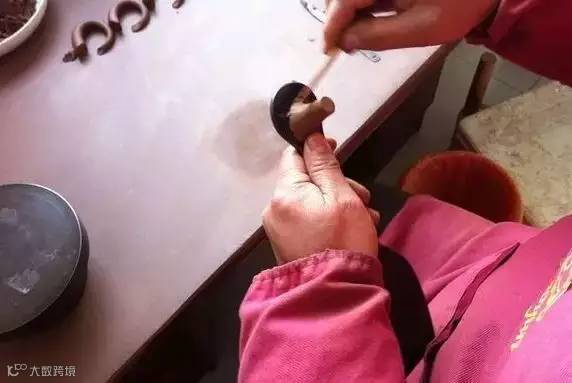 10、通(通嘴)。嘴搓好后,用铁尖刀插入嘴料中心点处,两手握尖刀在泥凳上,边转边通,使壶嘴坯料内外受到压力形成壶嘴内孔,然后,用手指夹住弯出所需要的弧度待用。