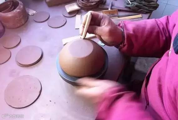 14、虚(虚盖顶)。壶盖板好后,盖虚片放在专门虚坨上,用手掌边轻轻虚出所盖拱弧度。