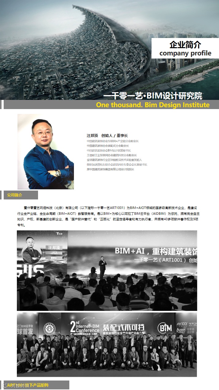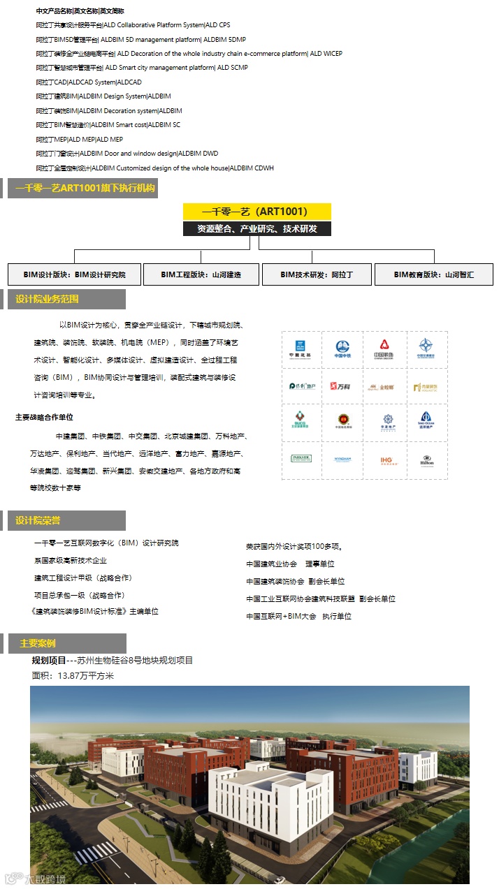 一千零一艺ART1001为BIM+AIOT领域的国家级技术企业,以BIM设计为核心、贯穿全产业链设计,下辖城市规划院、建筑院、装饰院、软装院、机电院,同时涵盖了环境艺术设计、智能化设计、多媒体设计、虚拟建造设计、全过程工程咨询等专业。