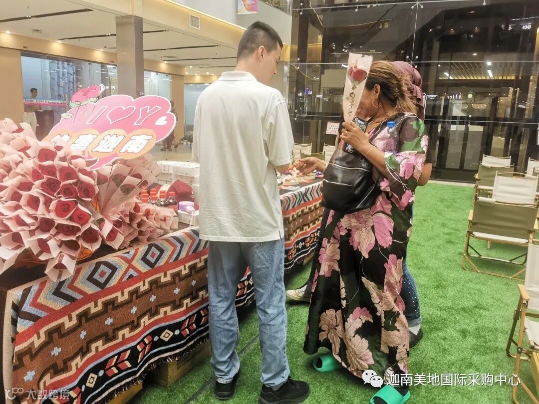由迦南翻译工作人员耐心为外贸采购商讲解活动,为进场的外贸采购商派发玫瑰鲜花,并邀请其参加打卡有礼活动。