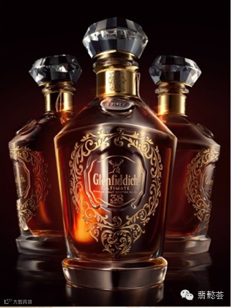 格兰菲迪尊致38年水晶瓶来自苏格兰屡获殊荣的家族水晶公司格兰凯恩(Glencairn),由熟练的水晶工匠纯手工吹制而成。瓶身上的雄鹿形象代表了格兰菲迪所在地,达夫镇的“鹿之谷”。完全按照钻石形状切割而成的水晶瓶头,每一面代表了这款高年份威士忌38年熟化时间的每一个年份的印记。瓶身上镶嵌24K叶形纹饰金箔。