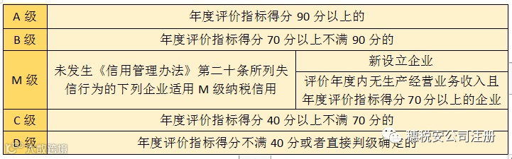 纳税信用等级是指税务机关根据纳税人履行纳税义务的情况,采取年度评价指标得分或直接判级两种方式,在每年的4月确定纳税人上一年度的纳税信用评价结果,纳税信用等级共有A、B、M、C、D五类,具体分类如下: