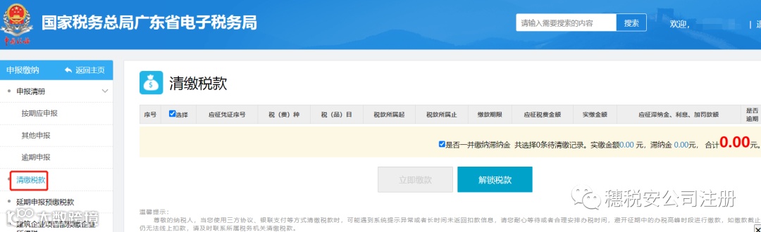 3.完成申报后,进入【我要办税】--【税费申报及缴纳】--【清缴税款】,系统将展示未锁定状态税款信息。选择需要缴纳的税款信息,点击【立即缴款】。