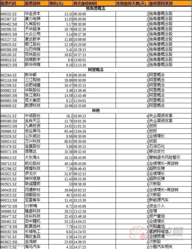 盘面上,次新总龙头万兴科技(300624)今日复牌再涨停,实现七连板。孙宏斌辞去乐视网(300104)董事长职务,乐视网今日复牌,超200万手大单封死跌停。传阿里巴巴研究A股上市,独角兽板块大涨7%,合肥城建(002208)、大众公用(600635)等10股涨停。宁德时代或超富士康IPO速度,天华超净(300390)涨停。独角兽概念大涨带动创投概念,张江高科(600895)、九鼎投资(600053)等多股涨停。微信及支付宝接入银联方案正制定,信雅达(600571)涨停。央企国企改革板块再度冲高,龙头中成股份(000151)收获四连板。