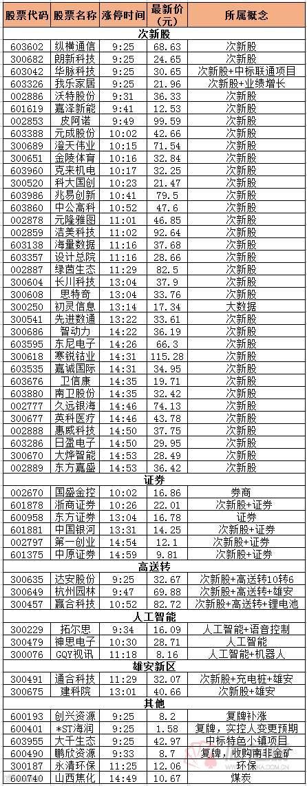 盘面上,周五强势上涨的煤炭板块早盘分化较为严重,山西焦化(600740)强势震荡,其余跟风股多数冲高回落,通信板块高潮后早盘分化加大,仅有龙头纵横通信(603602)和华脉科技(603042)封板。次新股板块出现分化,龙头纵横通信一字板涨停,嘉泽新能(601619)一字板开板回封,受到证金公司大幅增持券商股的消息刺激,券商板块集体大涨,浙商证券(601878),国盛金控(002670)领涨,保险股在中航资本(600705),中国太保(601601)的带动下大幅反弹,推动沪指反弹,雄安特色小镇概念股异动,但龙头华斯股份(002494)高开低走,未能带动特色小镇走强,我乐家居(603326),金陵体育(300651)等前期的低位次新股快速涨停,带动次新股补涨股大涨。拓尔思(300229)再度强势涨停,引领人工智能板块大涨,神思电子(300479)跟风涨停,高送转板块在皮阿诺(002853)快速涨停的带动下大幅反弹,杭州园林(300649)涨停助攻板块走强。互联网金融板块盘中拉升,带动创业板指数大幅冲高。山西焦化再度发力反弹,方大炭素(600516)止跌回升,涨价资源股集体反弹。午后张家港行(002839)大幅拉升至涨停,带动银行股反弹,中国银河(601881)和中原证券(601375)涨停,引领券商股二度上攻,东尼电子(603595)涨停,带动苹果概念股拉升,科蓝软件(300663)涨停,带动低位的次新股接力反弹。雄安板块盘中异动拉升,太空板业(300344)领涨。科大讯飞(002230)被砸翻绿,盘面情绪快速降温,两市指数小幅回落,多家封板股被砸开。临近尾盘,盛和资源(600392)大幅拉升,带动资源股集体大涨,北方稀土(600111)跟风反弹,柳钢股份(601003)拉升,带动钢铁股反弹。张家港行开板,带动银行股回落。山西焦化尾盘封板,带动煤炭股反弹。