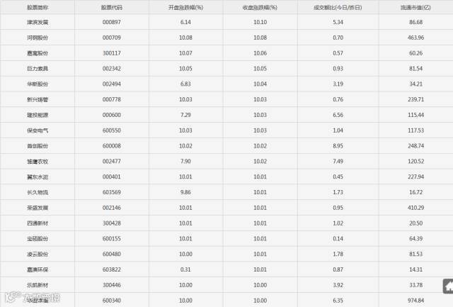 非一字板:津滨发展、长久物流、首钢股份、北京城建、银龙股份、华斯股份、雏鹰农牧、青龙管业、北新建材、龙洲股份