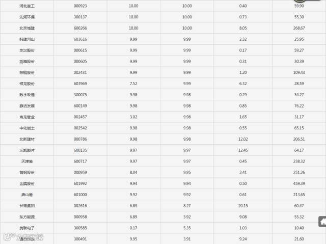 一字板:金隅股份、华夏幸福、冀东水泥、河钢股份、京汉股份、荣盛发展、河北宣工、唐山港、巨力索具、新兴铸管、四通新材、乐凯新材、保变电气、天津港、先河环保、廊坊发展、乐凯胶片、宝硕股份、棕榈股份、凌云股份、中化岩土、建投能源、韩建河山、渤海股份、数字政通、中持股份、