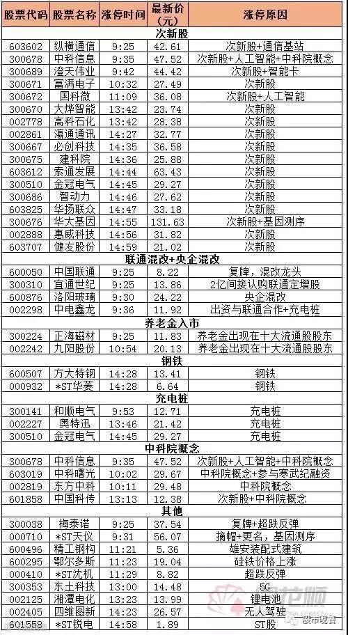 盘面上,周五大涨的混改概念分化加大,龙头洛阳玻璃(600876)封死第三板,跟风股铁龙物流(600125)封板被砸,中国核建(601611)冲高回落,混改股再度回落,中国联通(600050)复牌一字板涨停,同时复牌的苏宁云商(002024)和网宿科技(300017)等受益股多数冲高回落,混改板块内部分歧加大。养老金入市,进入九阳股份(002242)和正海磁材(300224)的十大流通股股东,正海磁材封死一字板,带动稀土永磁板块走强,九阳股份爆量开板回封。中科信息(300678)再度封板成妖,带动次新股和人工智能板块反弹,新股纵横通信(603602)2连板后,新股澄天伟业(300689)开板回封。世联行(002285)盘中大幅拉升,带动租售同权板块反弹,中国铝业(601600)大幅拉升,引领涨价概念股反弹。精工钢构(600496)封板,带动建筑装饰板块拉升,午后中国科传(601858)再度回封,带动次新股大幅反弹,湘潭电化(002125)涨停,带动有色板块拉升,奥特讯封板,带动充电桩概念股反弹。建新矿业(000688)封板,资源股再度拉升。四维图新(002405)封板,带动中小创中的科技股大幅反弹,科大讯飞(002230)创日内新高,超跌的科技类次新股全面反弹局面打开。尾盘方大特钢(600507)涨停,助攻钢铁股涨幅居前。浙商证券(601878)尾盘拉升,带动证券股反弹。