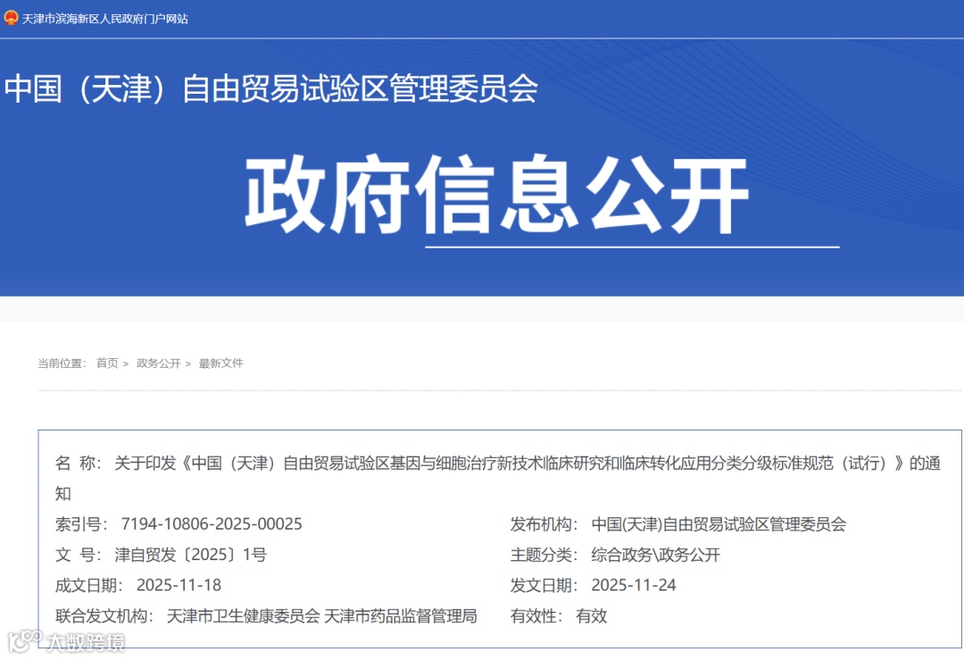 11月24日,中国(天津)自由贸易试验区管理委员会联合天津市卫生健康委员会、天津市药品监督管理局,正式印发了《中国(天津)自由贸易试验区基因与细胞治疗新技术临床研究和临床转化应用分类分级标准规范(试行)》,标志着天津在细胞与基因治疗(CGT)领域的管理改革上迈出关键一步。该规范试行期3年,旨在通过建立“风险分级、动态调整”的科学监管机制,为前沿技术的临床研究与转化提速。