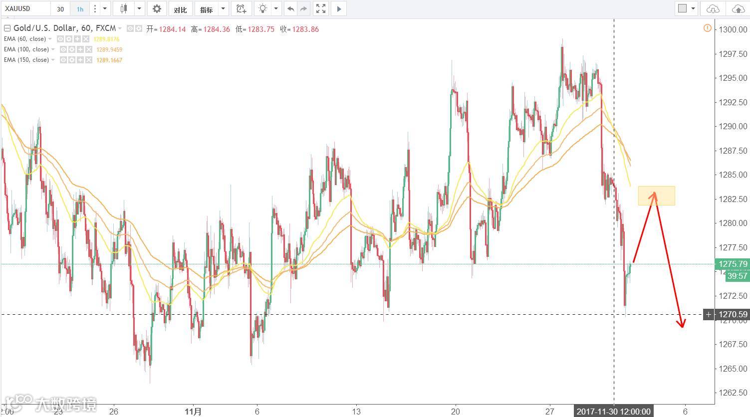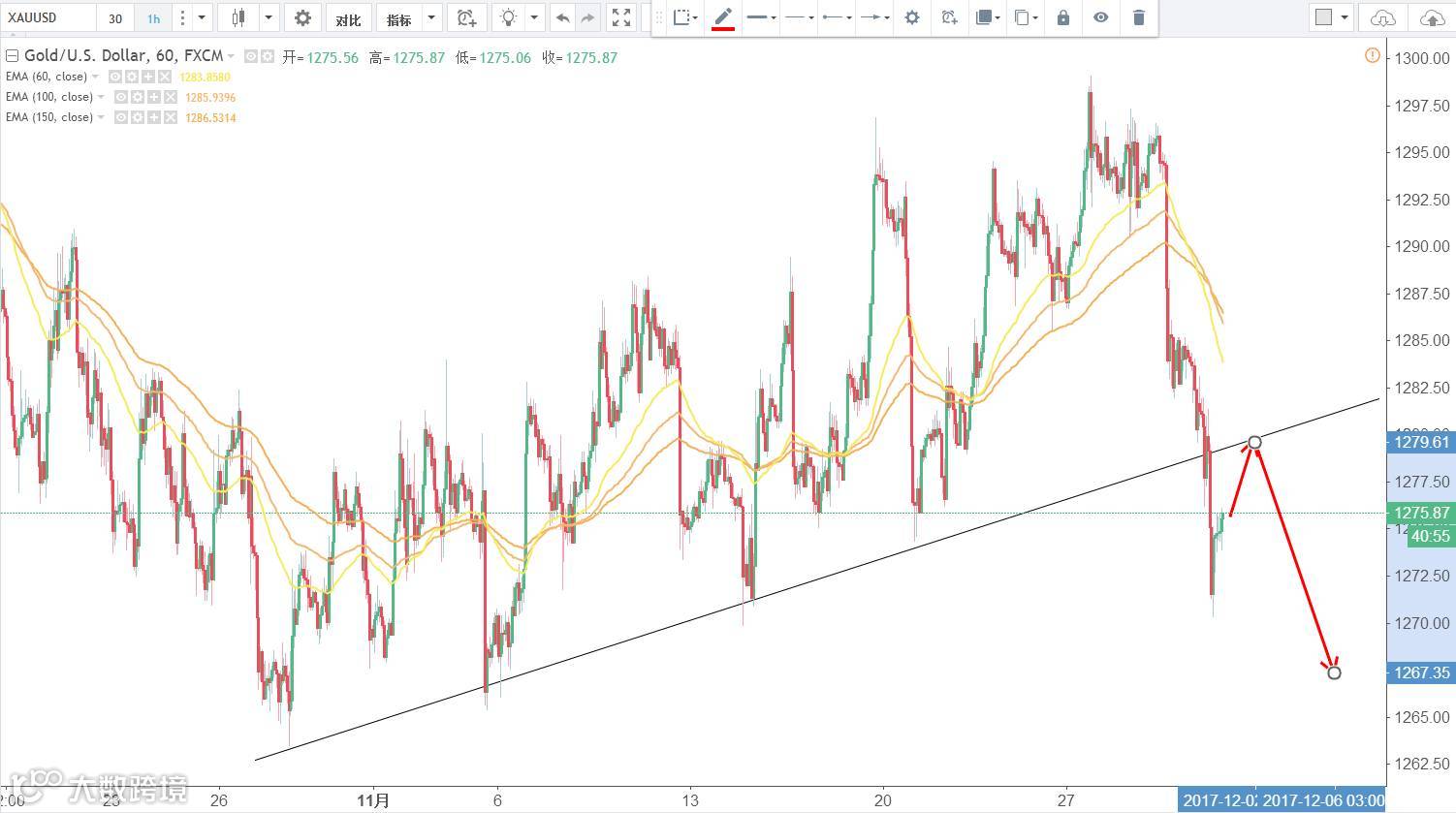 策略一:1小时上升趋势被跌破,今日压力在1278-1280之间,30分钟再次收出看跌吞没形态做空,止损形态之外加1美金,持仓暂定为3小时,获利超5美金,持仓过周末。(谨慎操作,请设置好止损线!)