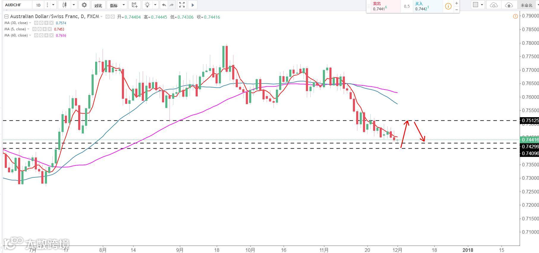 日线级别完全的空头排列,下方到达支撑区域0.7430-0.74,原则上逢高做空。