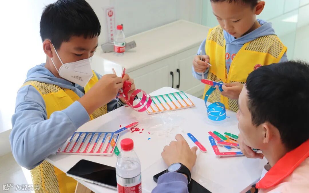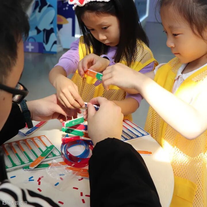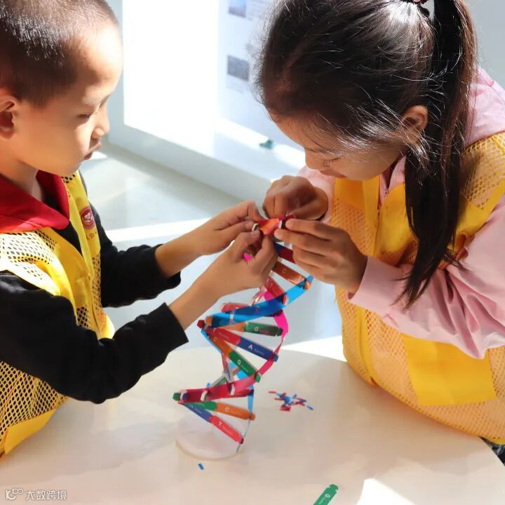 孩子们在讲解员和志愿者的引导下,纷纷化身为一个个DNA建造师,积极地研究模型的结构,动手连接碱基对和双链。一个个螺旋式上升的DNA模型逐渐成型,孩子们看着自己的作品满意极了。
