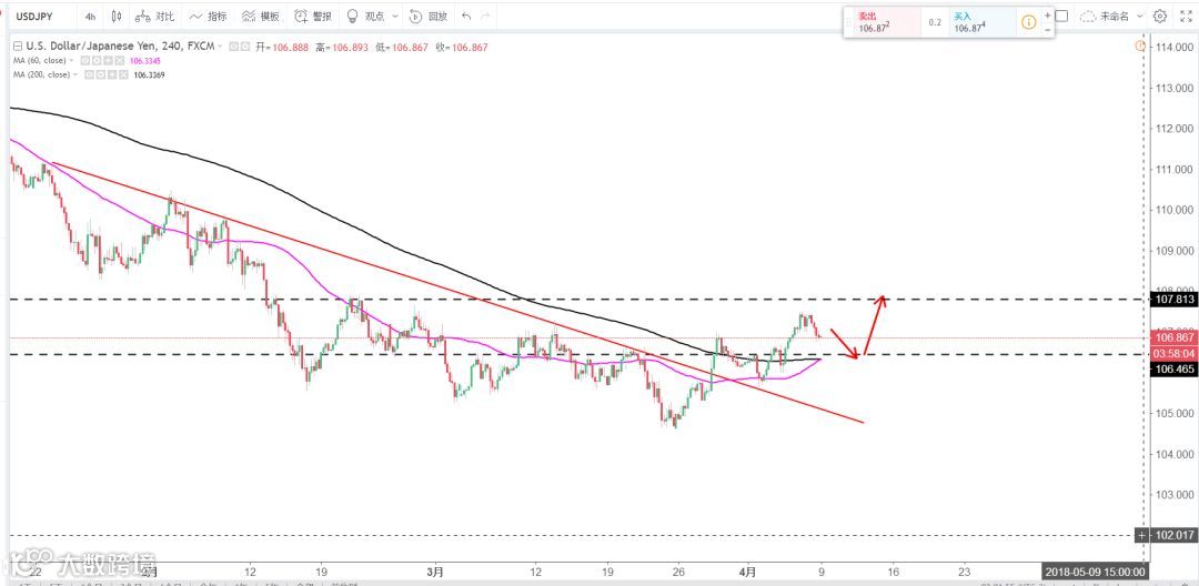 策略分析:4H级别完全突破下降通道步入反弹之中,原则上逢低做多为主,下方支撑106.5区域。