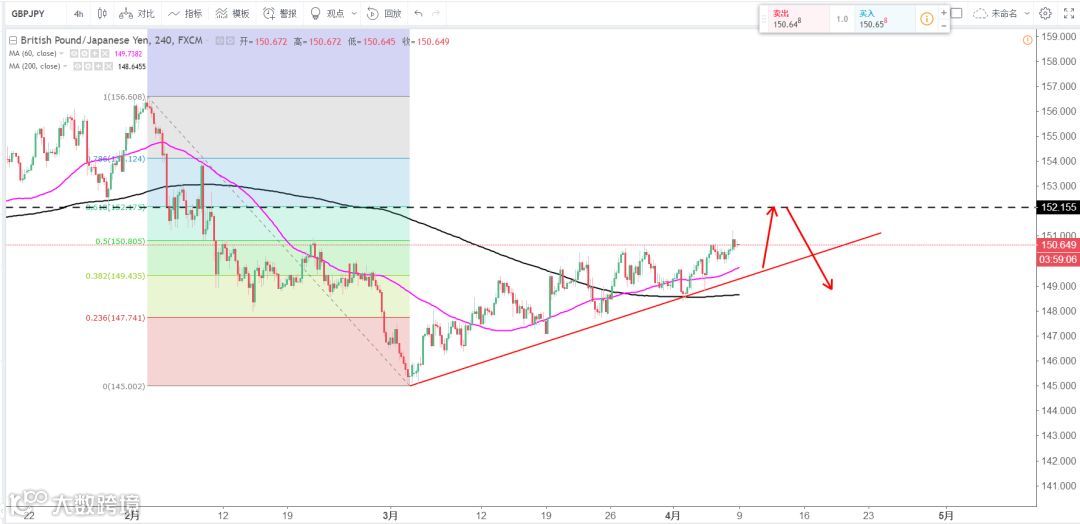 策略分析:4H上升通道保持完好,跌破前勿盲目布局空单,上方压力区152.15区域。