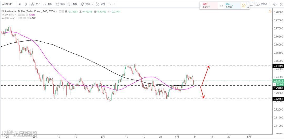 策略分析:低位大区间震荡,下方支撑0.7350区域为多空分水岭 ,上方看多下方看空,震荡大区间0.7480-0.7270区域。