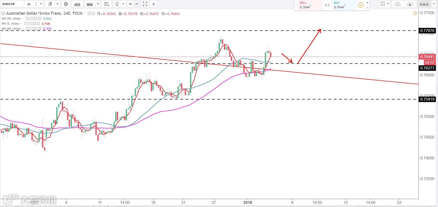 策略分析:昨日收出大阳线,重回0.7620上方,等待回踩后企稳布局多单,支撑位0.7625区域。