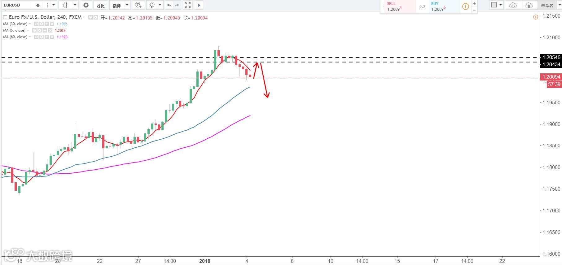 策略分析:昨日高位收出吞没型阴线,暗示短线多头告一段落进入调整周期,关注上方压力1.2045-1.2060区域压力。
