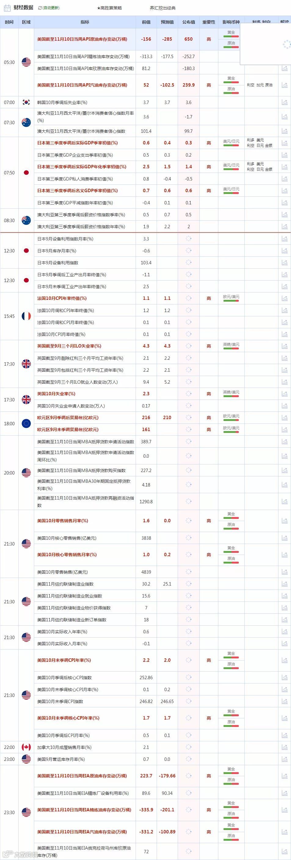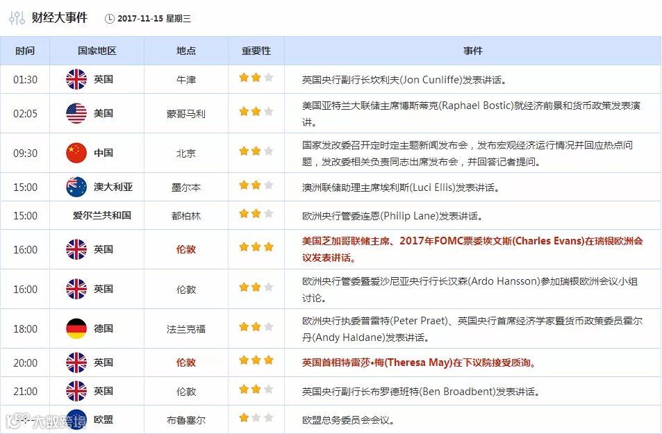 【财经数据】11月15日财经日历
