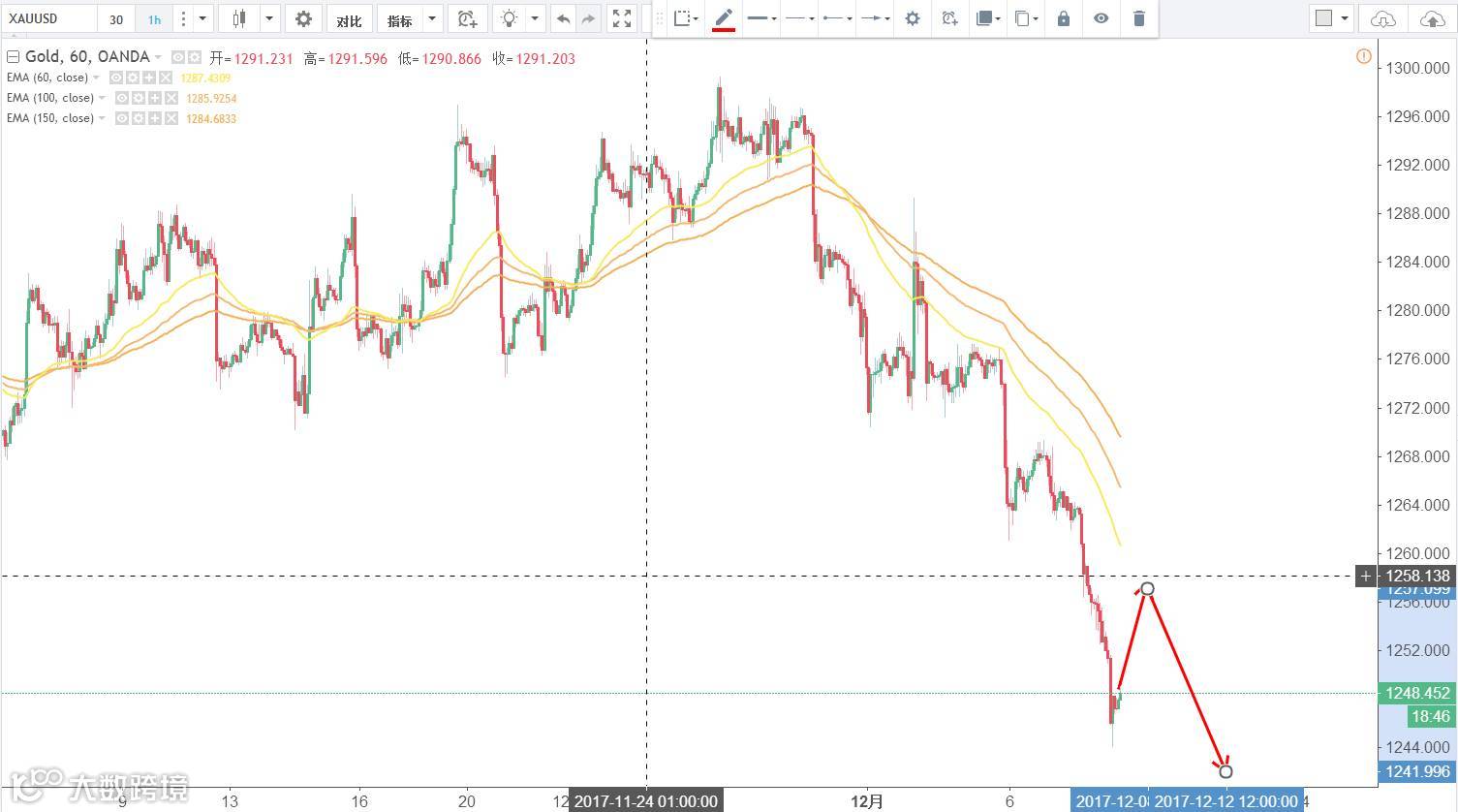交易策略:4小时三角形整理向下破位,反弹做空。1小时下降通道运行,今日上轨的压力在1275附近。30分钟形成了新的下降通道,目前上轨的压力在1257附近,30分钟触及收出看跌吞没形态做空,止损形态之外加1美金,持仓暂定为3个小时。(谨慎操作,请设置好止损线!)