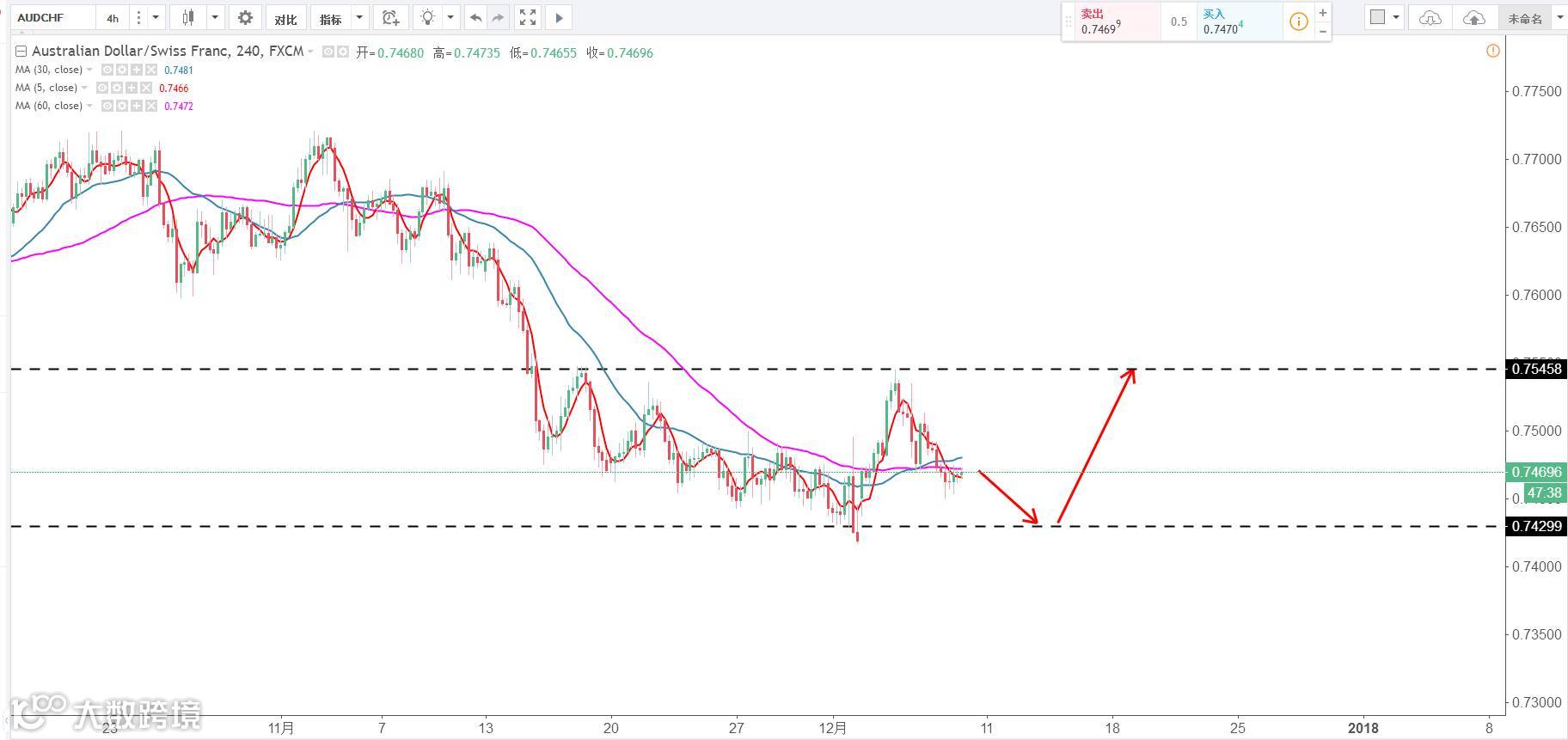 交易策略:等待再次测试0.7430企稳后做多,目标0.7540,止损0.74。(谨慎操作,请设置好止损线!)
