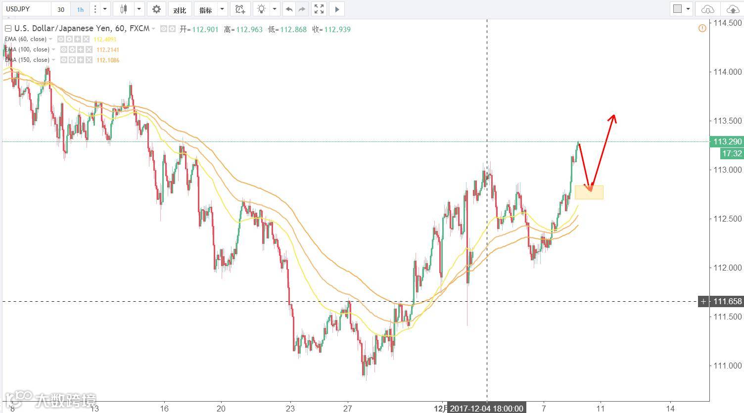技术点评:美元强劲,美元姐姐飙升,均线系统重回多头趋势,等待回调多,1Hrsi超买尽量不要追多。等待晚间非农数据的公布在作具体操作。